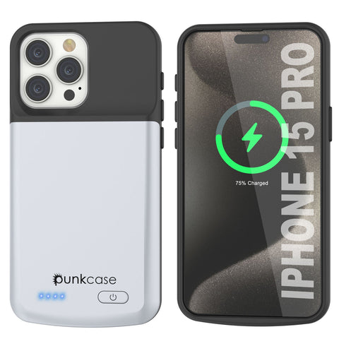 iPhone 15 Pro Battery Case, PunkJuice 5000mAH Fast Charging Power Bank W/ Screen Protector | [White]