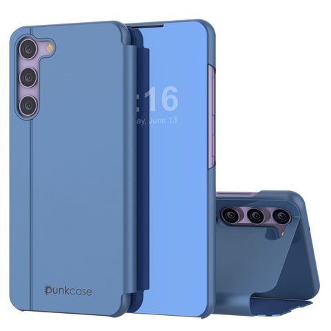 Punkcase S23 Reflector Case Protective Flip Cover W/Scratch Resistant Translucent Mirror Front & Non-Slip PU Leather Back Integrated Kickstand Compatible W/Samsung S23 (Blue)